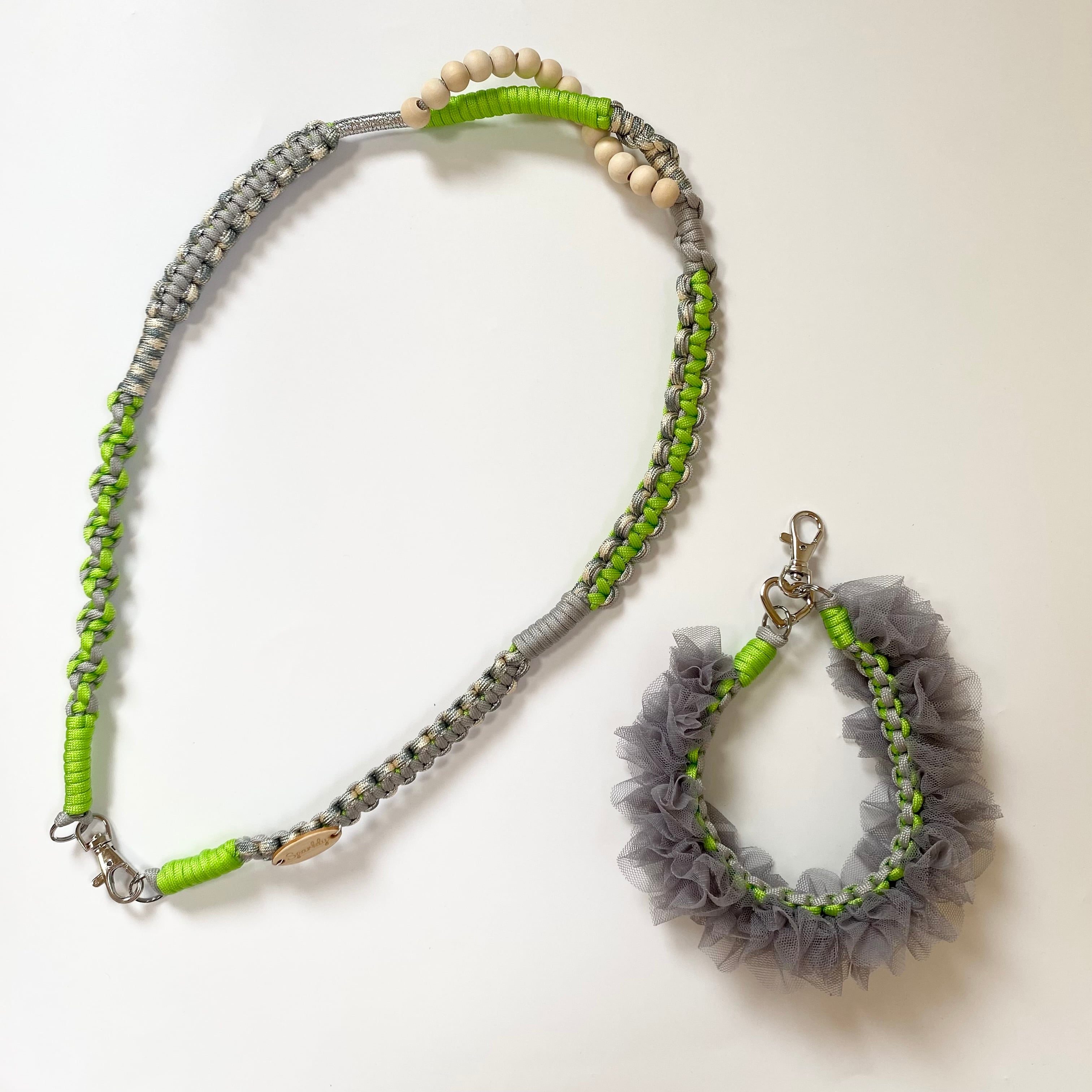 【127cm】スマホショルダー スマホストラップ グレー グリーン チュールレース ウッドビーズ